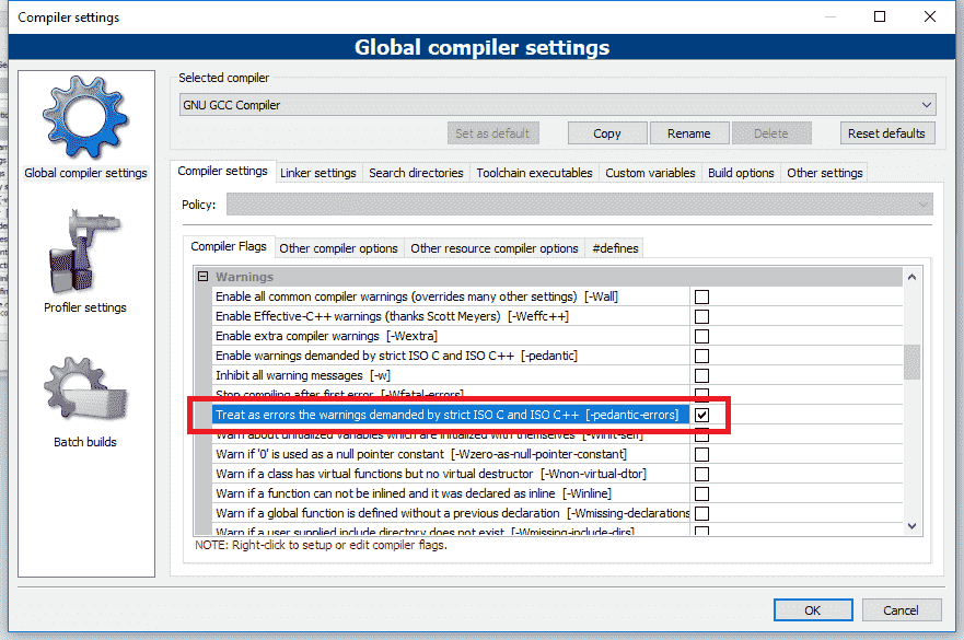 | 코드블록 사용자 (For Code::Blocks users) 설정 메뉴 > 컴파일러 > 컴파일러 플래그 탭을 통해 컴파일러 확장을 비활성화한 다음 -pedantic-errors 옵션을 찾아 확인합니다. ![]() |