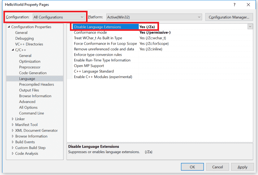 | Visual Studio 사용자의 경우 (For Visual Studio users) 컴파일러 확장을 비활성화하려면 솔루션 탐색기 창에서 프로젝트 이름을 마우스 오른쪽 버튼으로 클릭한 다음 속성을 선택합니다. ![]() 프로젝트 대화 상자에서 먼저 구성 필드가 모든 구성으로 설정되어 있는지 확인하십시오. 그런 다음 C/C++ > 언어 탭을 클릭하고 언어 확장 비활성화를 예(/Za)로 설정합니다. ![]() |