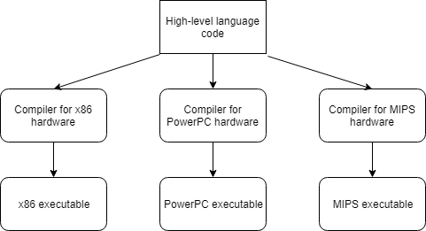둘째, 각 이진 숫자 세트는 CPU에 의해 이 두 숫자를 비교하거나 이 숫자를 해당 메모리 위치에 넣는 것과 같은 매우 특정한 작업을 수행하는 명령으로 해석됩니다. 그러나 CPU마다 명령어 세트가 다르기 때문에 한 CPU 유형에 대해 작성된 명령어는 동일한 명령어 세트를 공유하지 않는 CPU에서 사용할 수 없습니다. 이것은 일반적으로 프로그램이 다른 유형의 시스템으로 이식될 수 없었고(주요 재작업 없이 사용 가능) 처음부터 다시 작성해야 함을 의미했습니다.