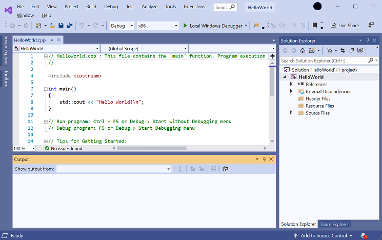 창의 왼쪽 또는 오른쪽에 솔루션 탐색기라는 창이 표시되어야 합니다. 이 창 내에서 Visual Studio는 솔루션(솔루션 'HelloWorld')을 생성했습니다. 그 안에 이름이 굵게 표시된 것은 새 프로젝트(HelloWorld)입니다. 프로젝트 내에서 Visual Studio는 HelloWorld.cpp(소스 파일 트리 항목 아래)를 포함하여 여러 파일을 생성했습니다. 지금은 무시할 수 있는 다른 .cpp 또는 .h 파일도 볼 수 있습니다.